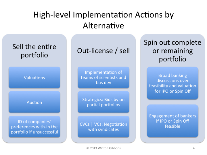 However, typical business development outlicensing can take some time for each compound, series, or program. This would be problematic by an effort to do this in multiple areas concurrently. Headcount resources would likely be insufficient if the divestiture were desired to be fast.