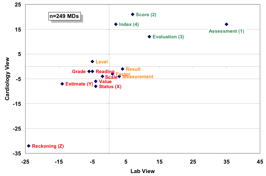 The objective was to determine which terms would be most credible to describe a diagnostic result, especially if it were a multivariate index of sorts. Additionally, the least credible terms were sought.