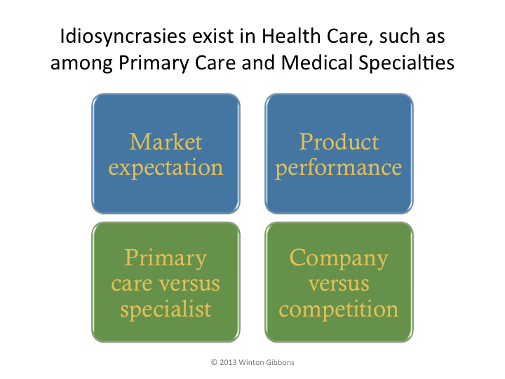 To complete the example, idiosyncrasies also exist in Health Care, such as among primary care and medical specialties.